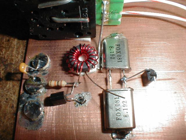 Lesson 8 Lesson 8 detailed construction of the PLL reference oscillator. This runs at around 8.192MHz, and it can be varied about 10KHz (mine only seems to be about 5KHz right now) by pulling two crystals with a varactor diode. This is controlled by the main tuning 10-turn potentiometer. This was a relatively easy circuit to assemble because it is pretty simple. Mine worked without making any major changes. I hooked it up to make sure it worked, so that if I had problems farther along in the construction, I would be able to rule out a problem in the reference oscillator.