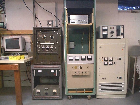 Here are a few VHF/UHF amplifiers. The "Green Machine" on the left is a US Military surplus AM-494. It runs a pair of 4CX250's on 144MHz. The RF deck is still pretty much original but I've rebuilt the B+ and screen supplies. The center rack has two 423 amps which both belong to WB9UAI. The top on is a K2RIW style 2 x 4CX250 and the bottom one is a converted Motorola commercial unit.