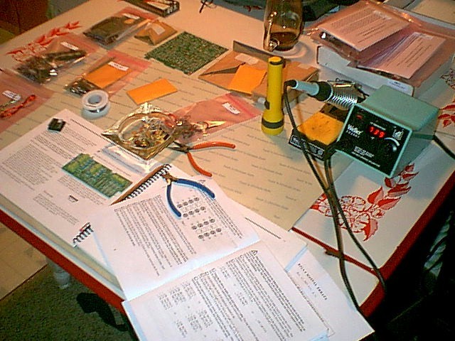 This is where I do the building and repairs. This is where I have the most fun, and experience the most frustrations of this hobby of mine. I'm learning quite a bit, but still have a LONG way to go. You can't see it in this picture, but one of the most important tools for me was a lamp/magnifying glass that Linda picked up for me. It's one of those that clamps on to the side of the table, and stretches out and stays where you put it. I don't have the eagle eyes I did when I was a bit younger, so using the 'glass' to look at the tiny print on some of the parts has saved me from a few mistakes. At times I've used it while soldering also. This picture was taken during the first stage of building the K1 radio. Although I tried, the table certainly didn't stay this organized! Shortly after this picture was taken, another bench tool arrived that has proven invaluable for my fumble-fingers - a PanaVise circuit board holder. I know that some builders don't like to use circuit board holders, but I think it helped me a great deal. |