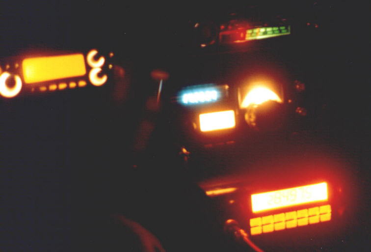 10. View from the now retired Chev Wagon "cockpit". Lit up: HTX 242, Broksonic HiFi am/fm cassette deck *G* ($250 in 1985), TS-120S, and another RCI 2950.
