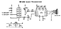 The transceiver is based on the MAX232A IC for generating and receiving RS-232 compatible voltage signals. The receiving sensor is an NPN infrared photo-transistor (OP505A). I chose an infrared photo-transistor to minimise ambient light interference. Although the laser wavelength is in the visible spectrum (~670nm) the photo-transistor�s broad response band (550nm to 1050nm) is wide enough to sense the intense laser beam. The signal from the photo-transistor is buffered via a pair of Schmitt trigger buffers to clean up and square the signal. The output of the second buffer is then directly converted to a RS-232 standard signal via the MAX232A.