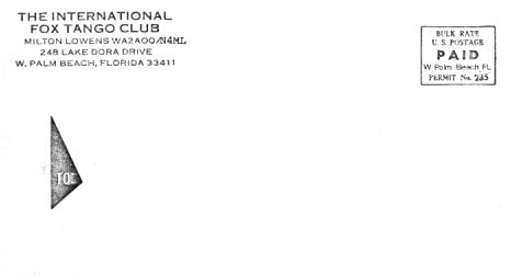 Over the 14 year span of the Fox Tango Newsletters, Milt mailed the publications from where he was. These locations included: New York, West Palm Beach FL, and Mexico. The earliest of the Newsletters were mailed in member-supplied SASEs. In fact, the original Newsletters had no mailing section whatsoever. They were simply folded and inserted into envelopes and mailed. I do not have an image of those mailings. Later Newsletters did have a postal-friendly layout as the Newsletter format changed to the familiar 8-1/2"x11" and were folded in half prior to being mailed. Cancelled stamps can be seen. Eventually, Milt obtained Postal Permits during the peak years of the publication process which lasted thru the last issue in 1985. From 1977 thru 1985, all publications are from Milt's home in W. Palm Beach, FL.Image of a March 1974 edition postmarked from San Miguel Mexico, dated 19FEB74. Milt's callsign is WA2AOQ.
