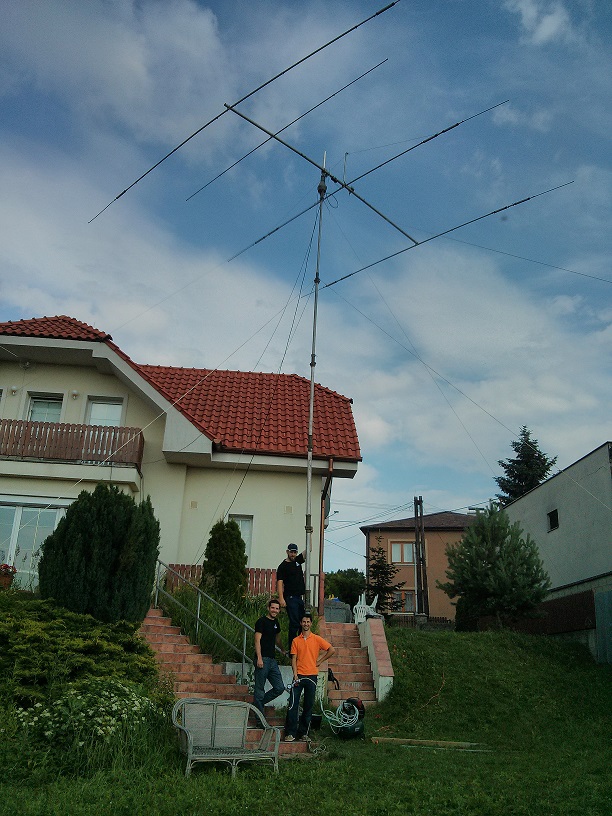 Have you ever seen an entire HF yagi antenna and mast go flying in the air like a rocket? For OM3BD 2013, I decided to focus on HF for a change. I brought a used Cushcraft A4S tri-band yagi from the USA, and my friend Filip OM1AI loaned me a Magirus telescopic mast. The Magirus is a Russian military mast, it comes in several different sizes and types. This one is 35' tall and is raised and lowered pneumatically. That means you raise it by pumping air into it, either by hand with a bicycle pump or by use of an electric compressor. Here is how it looked after we first put it up: