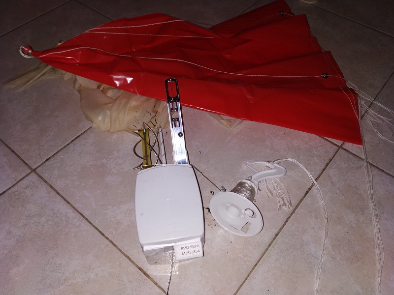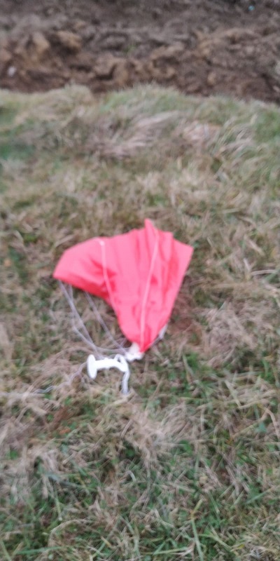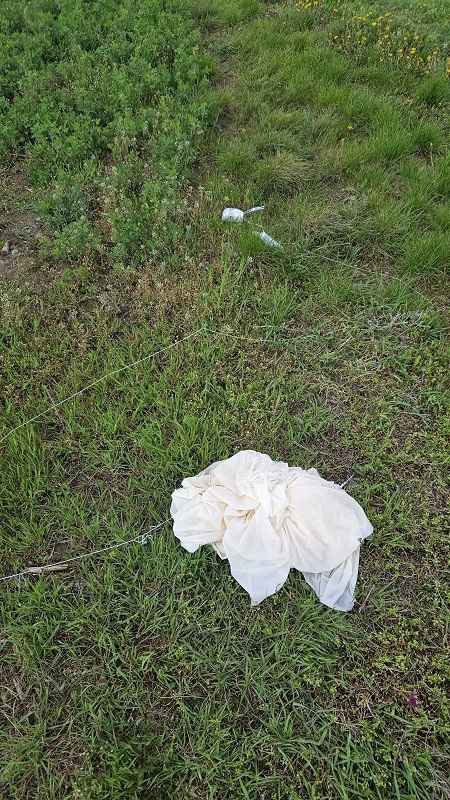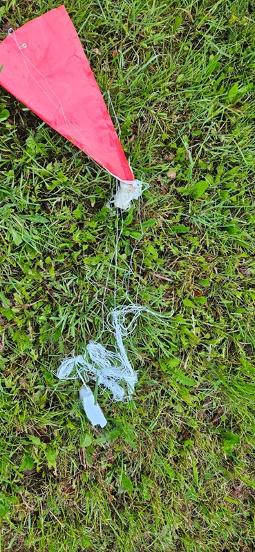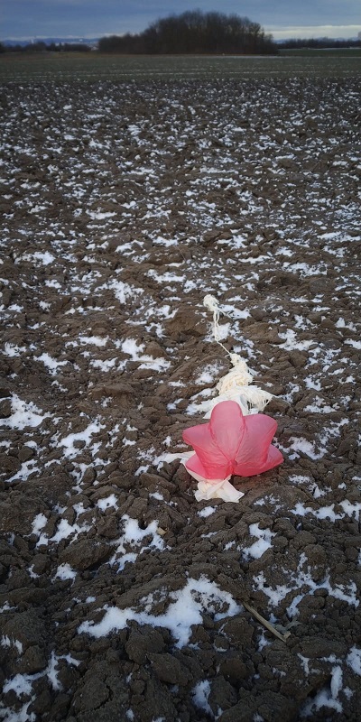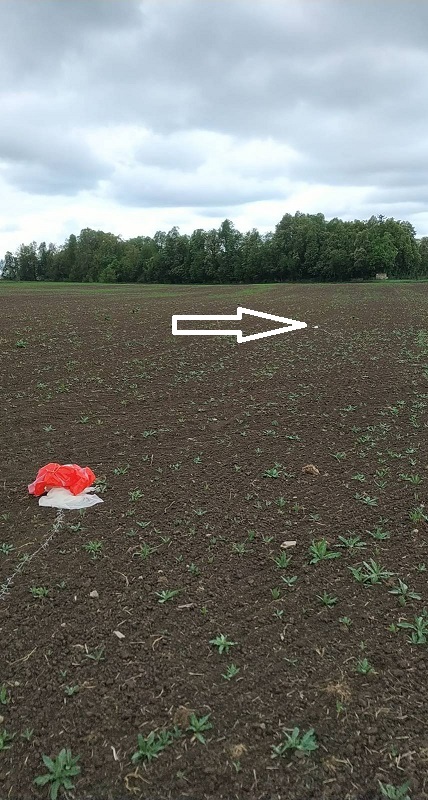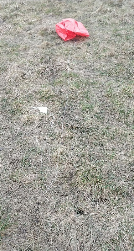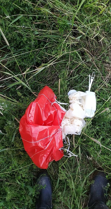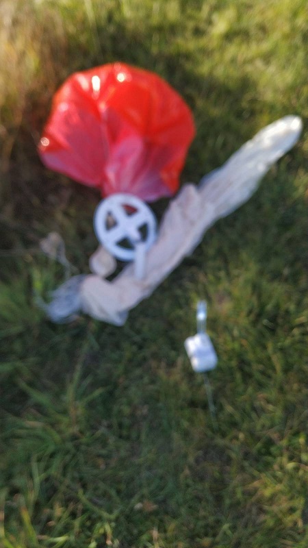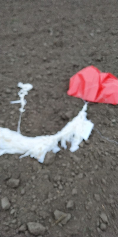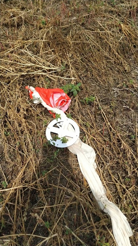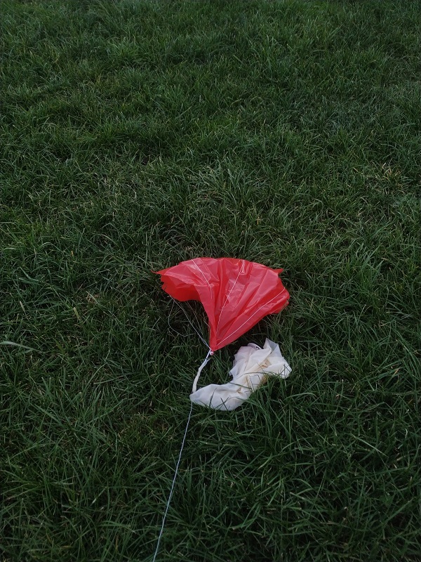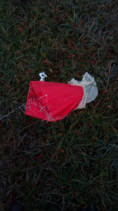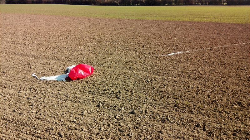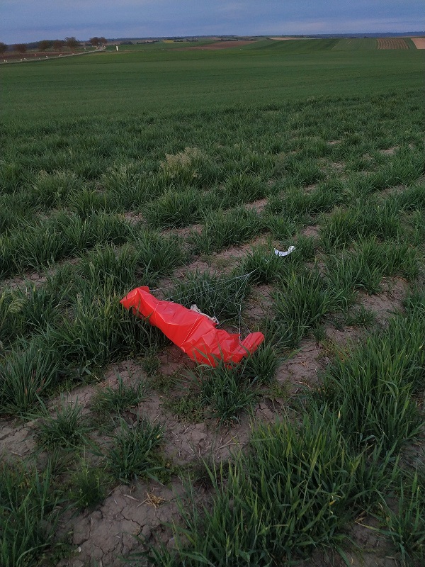 Der große Ballonrest kam als Erster, gefolgt vom Fallschirm, der zwar ganz offen war,