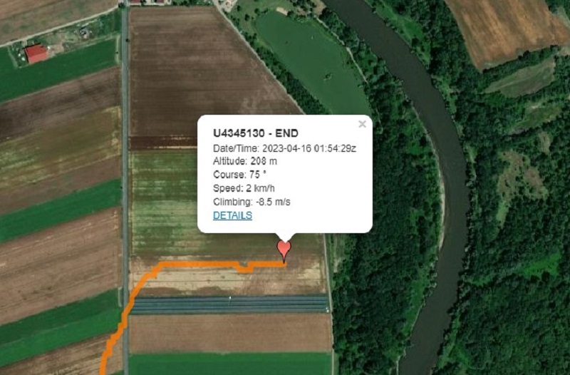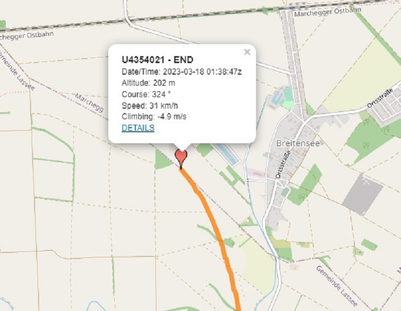 Flugspur mit letzter Position in 596m Höhe. Landehöhe 123m. Bis Boden