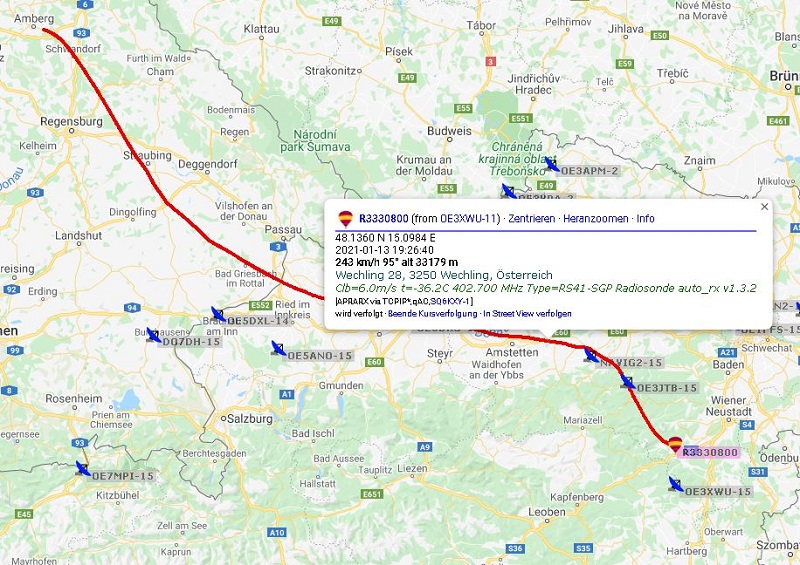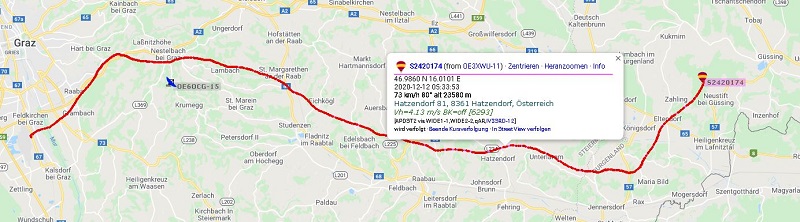 Flugstrecke am 24.2.2021 mit 34.908m größter Höhe