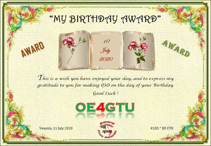 The award is issued to OM/SWL who will make 5 or more QSO/HRD with any radio amateur station on the day of his/her birthday. The date of your birthday must be unique on the application, no other date is allowed. Example : if your birthday is on June 3 your application must show 5 QSO/HRD only on June 3. You may apply for different years, example: June 3, 2004 or June 3 2007 etc.