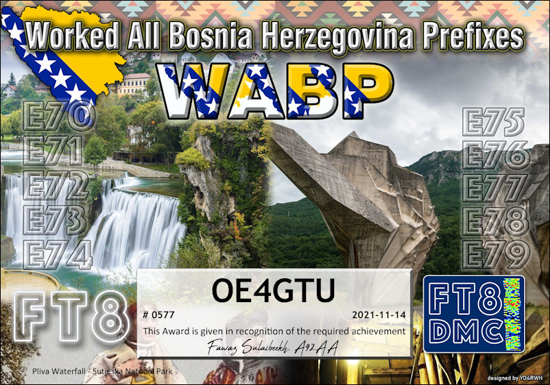 In recognition of international two-way FT8 amateur radio communication, the FT8 Digital Mode Club (FT8DMC) WORKED ALL BOSNIA & HERZEGOVINA PREFIXES-certificates to amateur radio stations of the world. Qualification for the FT8 WABP award is based on an examination by the FT8 WABP Award Manager, from QSOs that the applicant has made contacts with 5 amateur radio station from all Prefixes.