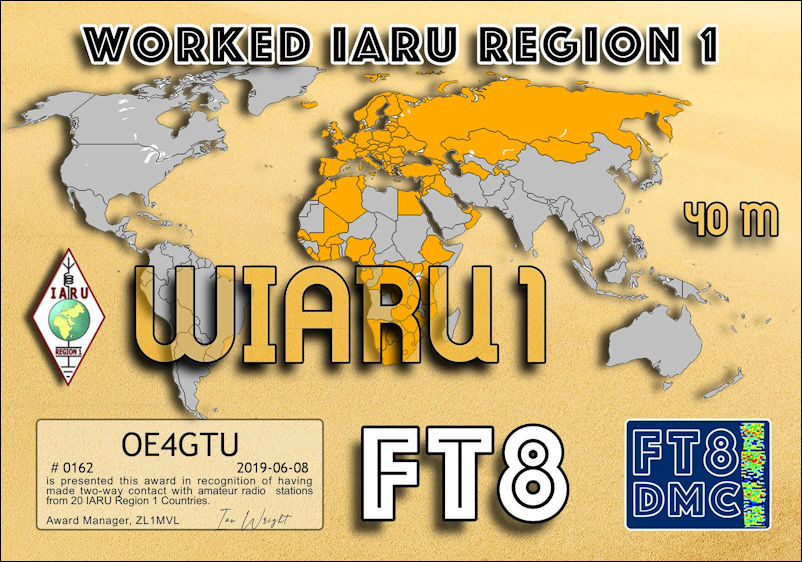 In recognition of international two-way FT8 amateur radio communication, the FT8 Digital Mode Club (FT8DMC) issues Worked-International-Amateur-Radio-Union-1 award certificates to amateur radio stations and SWL of the world. Qualification for the FT8 WIARU1 award is based on an examination by the FT8 WIAU1 Award Manager, from QSOs that the applicant has made with minimum 20 IARU Region 1 countries. All contacts must be made from the same country (DXCC-entity). Band endorsements for 6, 10, 12, 15, 17, 20, 30, 40, 60, 80, 160m available.