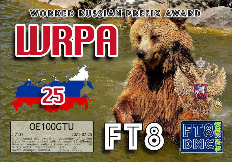 In recognition of international two-way FT8 amateur radio communication, the FT8 Digital Mode Club (FT8DMC) issues Worked-Russian-Prefix-Award certificates to amateur radio stations of the world. Qualification for the FT8 WRPA award is based on an examination by the FT8 WRPA Award Manager, from QSOs that the applicant has made contact with Russian amateur radio station with minimum 25 different amateur radio stations each having call letters with a different prefix. All contacts must be made from the same country (DXCC-entity).