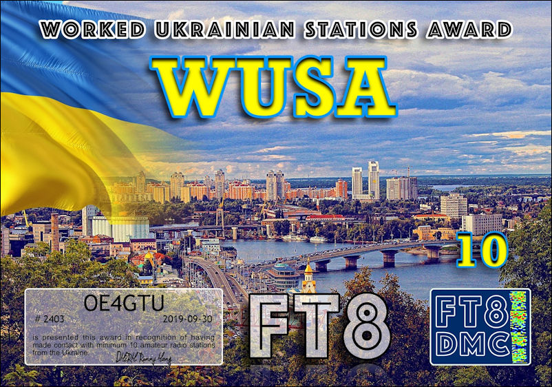 In recognition of international two-way FT8 amateur radio communication, the FT8 Digital Mode Club (FT8DMC) issues Worked-Ukrainian-Stations-Award certificates to amateur radio stations and SWL of the world. Qualification for the FT8 WUSA award is based on an examination by the FT8 WUSA Award Manager.