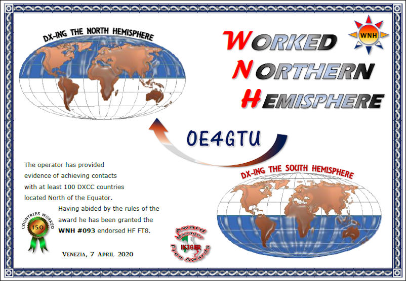 The “WNH” diploma is granted to both OM/SWL who will work/hear at least 100 of the 240 DXCC countries listed in the table at the bottom.