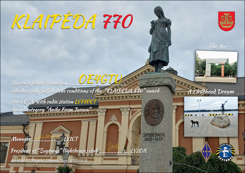 The callsign LY770CT was issued to commemorate the 770th anniversary of the founding of the city of Klaipėda.
