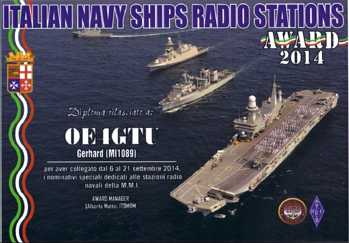 The Diploma ARMI called "ITALIAN NAVY SHIP RADIO STATIONS" is designed to remember the Naval Radio Station of the Italian Navy from 1960 to today and encourage Radio in all ways with all amateur radio stations.
