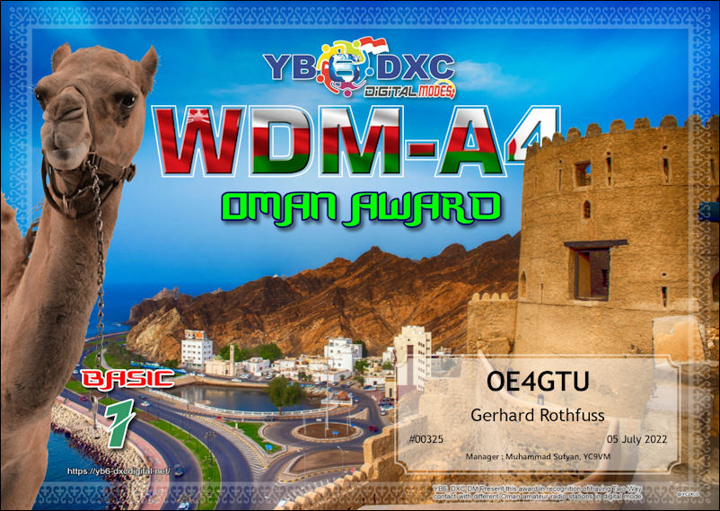 In Anerkennung der Funkamateurkommunikation mit Mode Digital.Die Qualifikation zum WDM-A4 Award basiert auf einer Prüfung des Adif-Logfiles durch den Award Manager. Durch die Bewerbung muss der Bewerber nachweisen, mit mindestens 1 Funkstation aus dem Oman mit dem Präfix A4 kommuniziert zu haben.