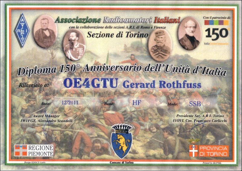 5) To conducted the Award is not necessary a QSL card. Is sufficient a copy of log of Qso, with a signature from the President or Haward Manager of the local Section, or, for the OM thet not subscribe to the association, with a singature from 2 OM. The application form is available on the Download Section of the Website of the Award (http://www.dui150.it/) .