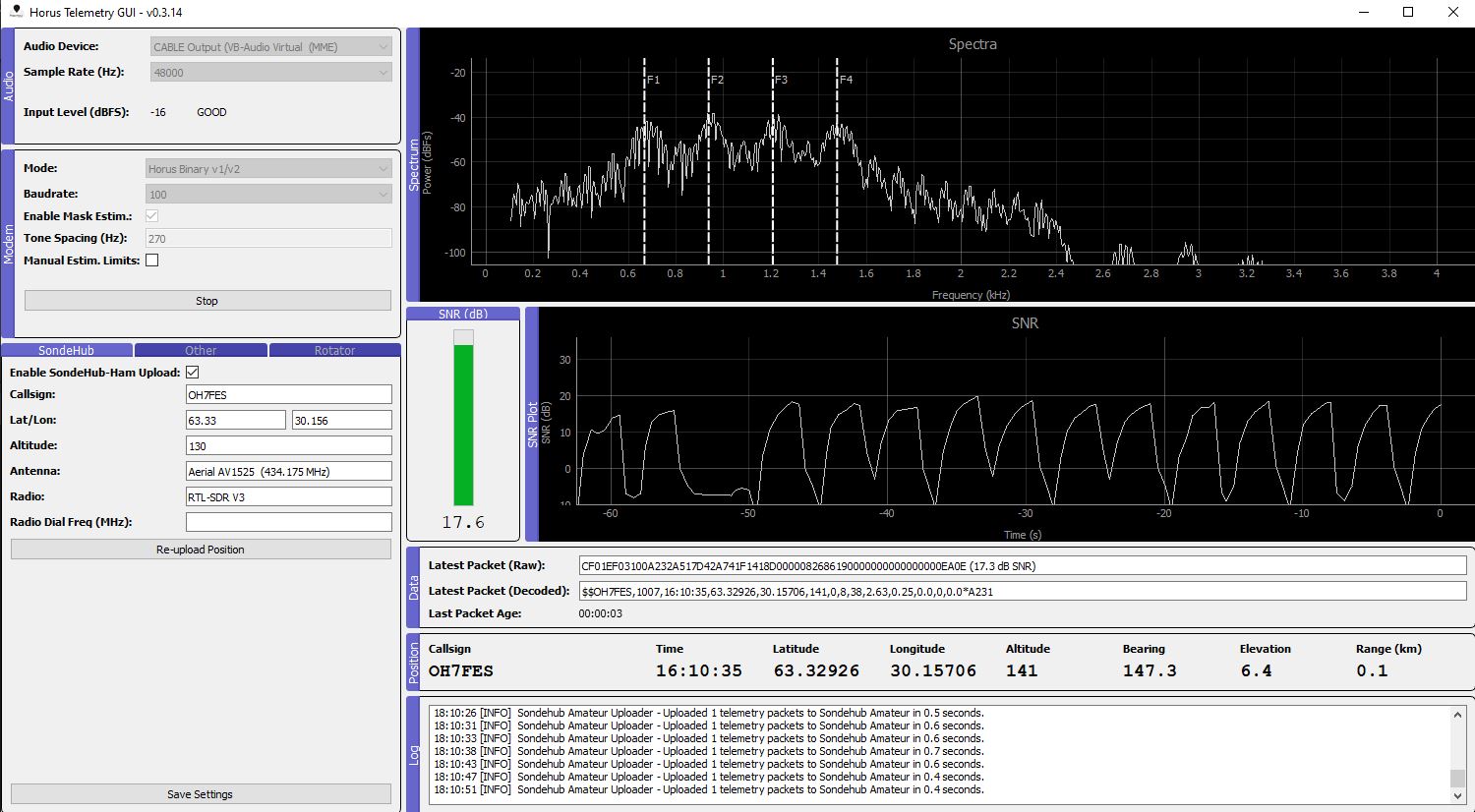 OH7FES Vastaanottaa tarvittaessa Horus Binary 4FSK v2 modea USB, millä tahansa taajuudella ja 432.500 APRS.