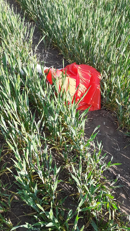 tatsächlich konnte ich den roten Fallschirm in einer der Traktoren Fahrspuren entdecken. Er hatte sich ganz unten