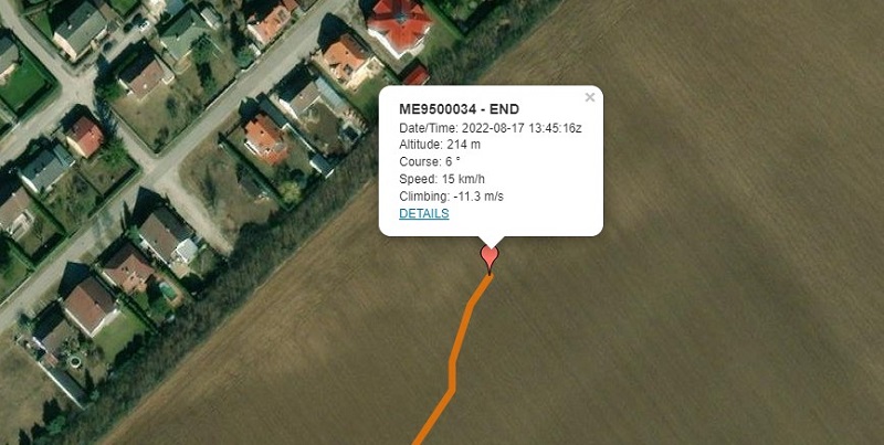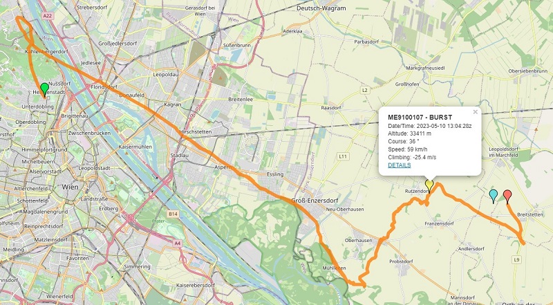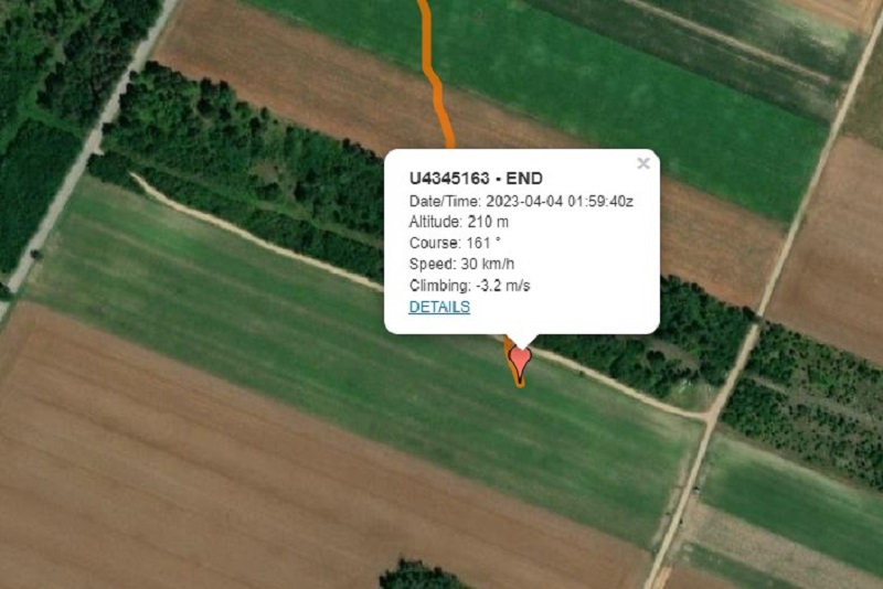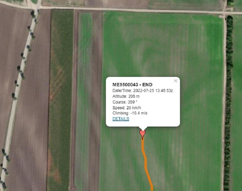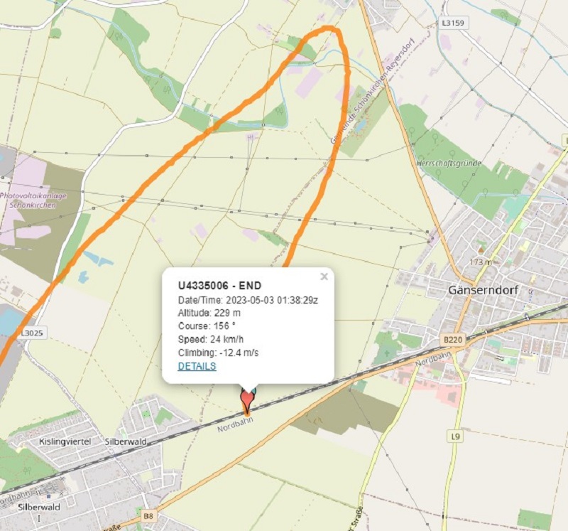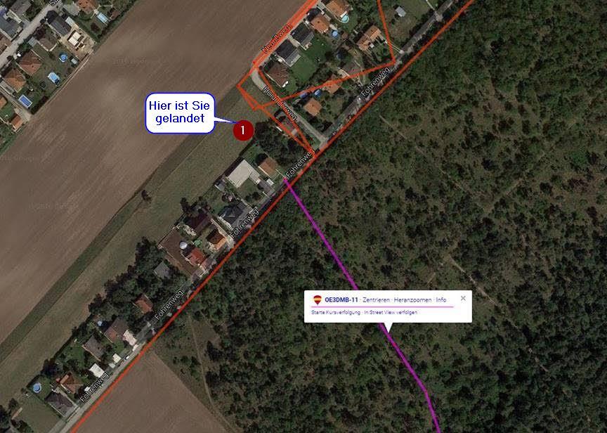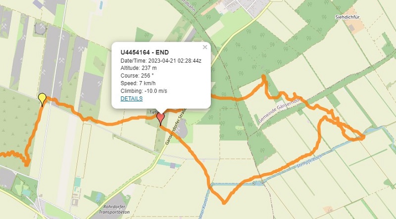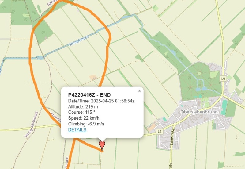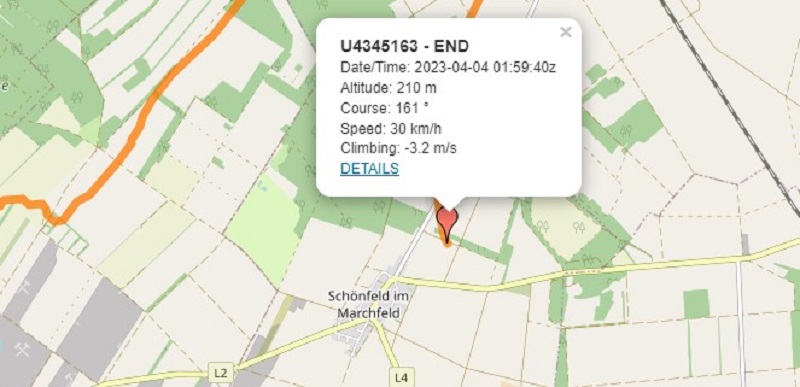 Flugspur mit letzter Position in 596m Höhe. Landehöhe 123m. Bis Boden
