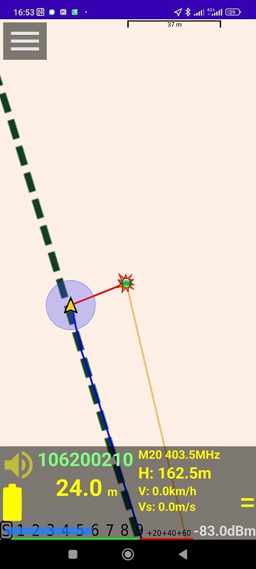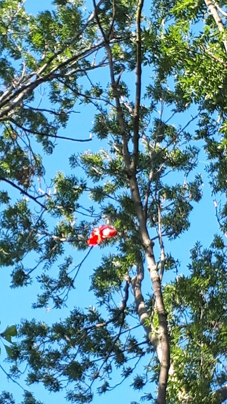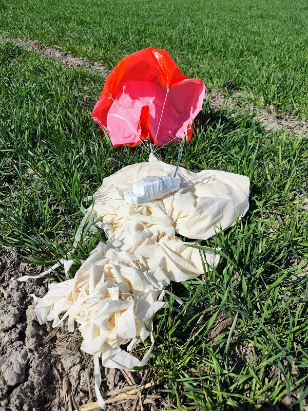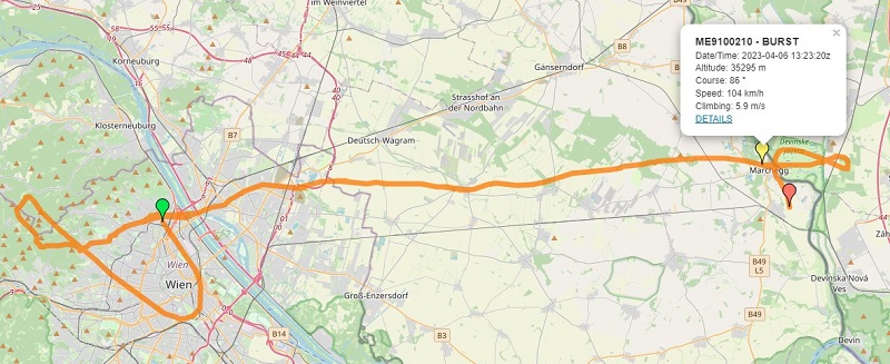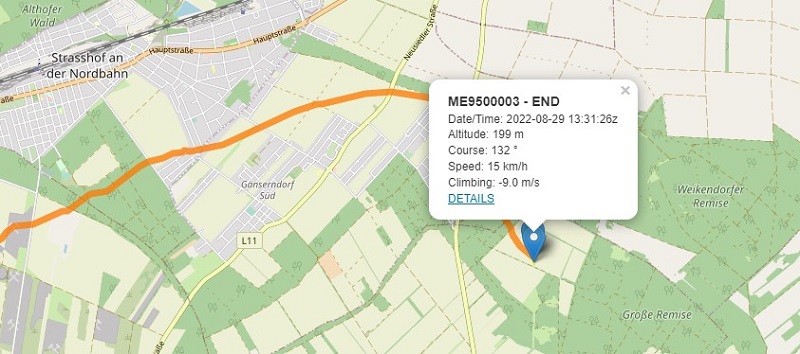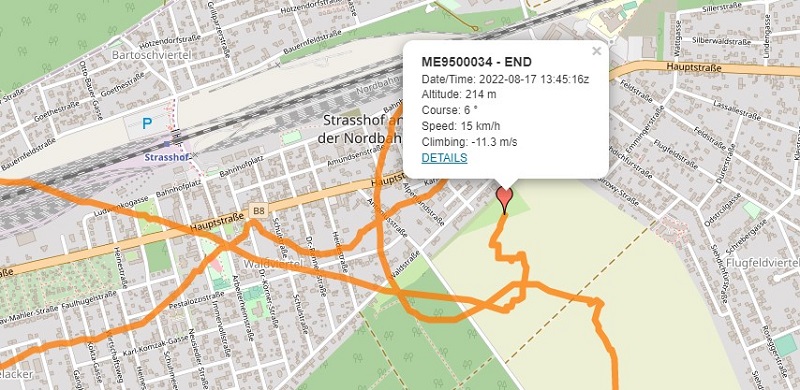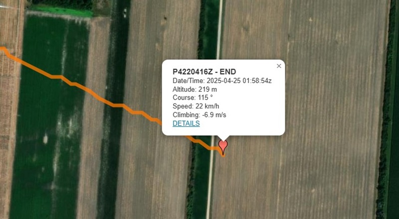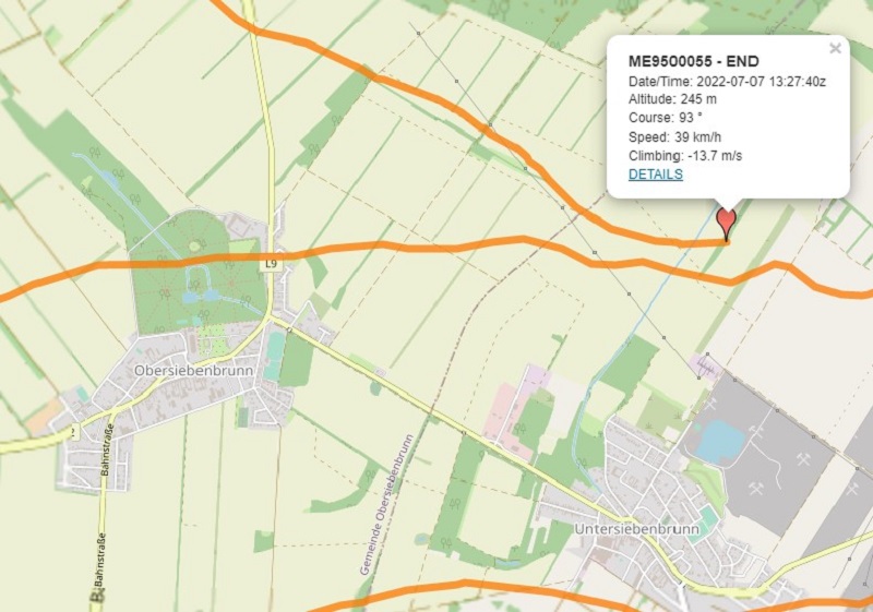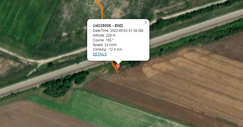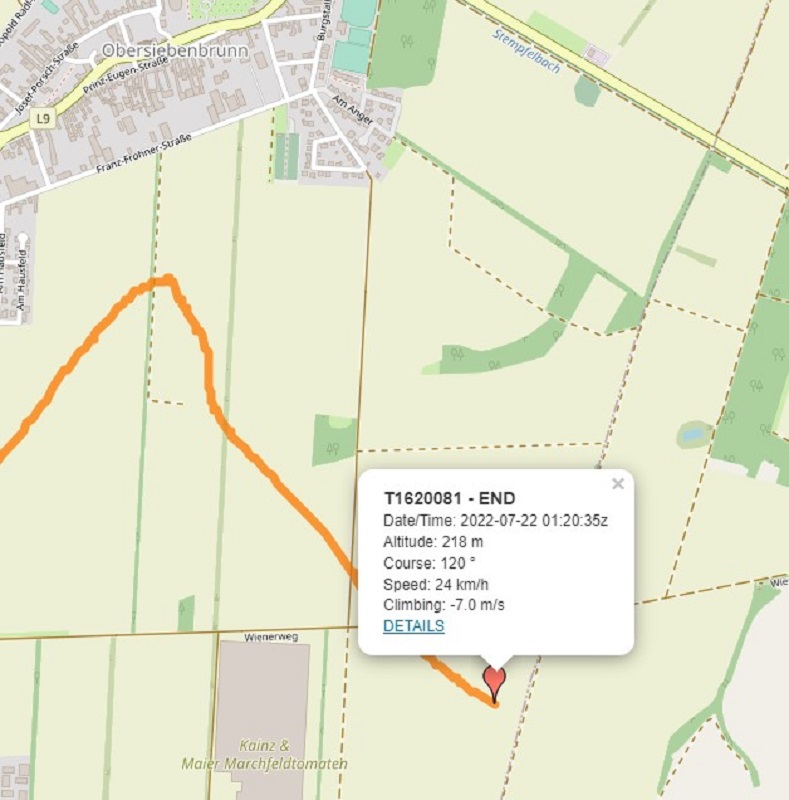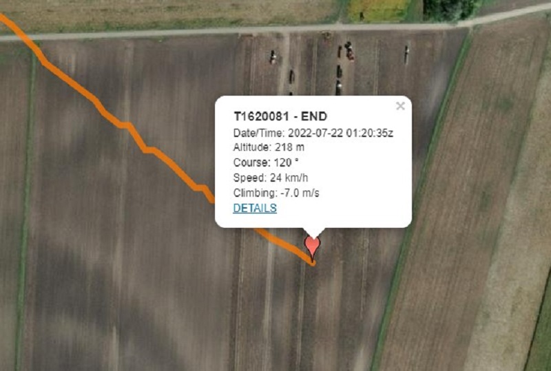 Flugspur mit letzter Position in 596m Höhe. Landehöhe 123m. Bis Boden