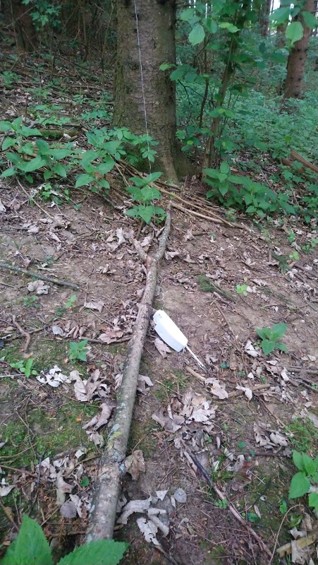 Das Gespann lag gut erreichbar am Boden, die Schnur führte auf einen Baum und wieder herunter, so dass das einsammeln keine Herausforderung darstellte.