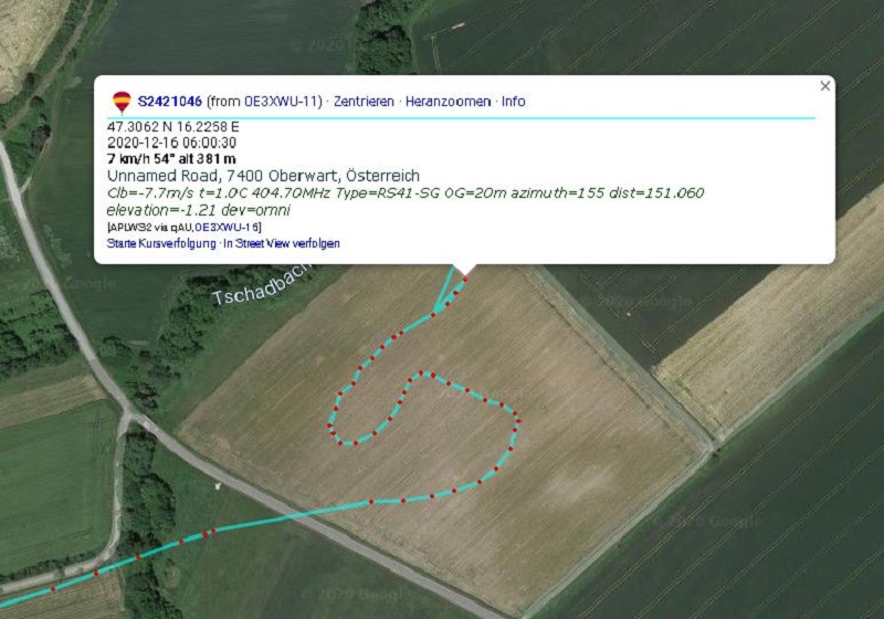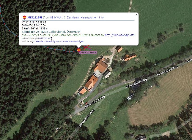 Fritz OE1FFS hatte mir inzwischen schon seine Schätzung der Landestelle verraten, was sich fast als richtig erwies.