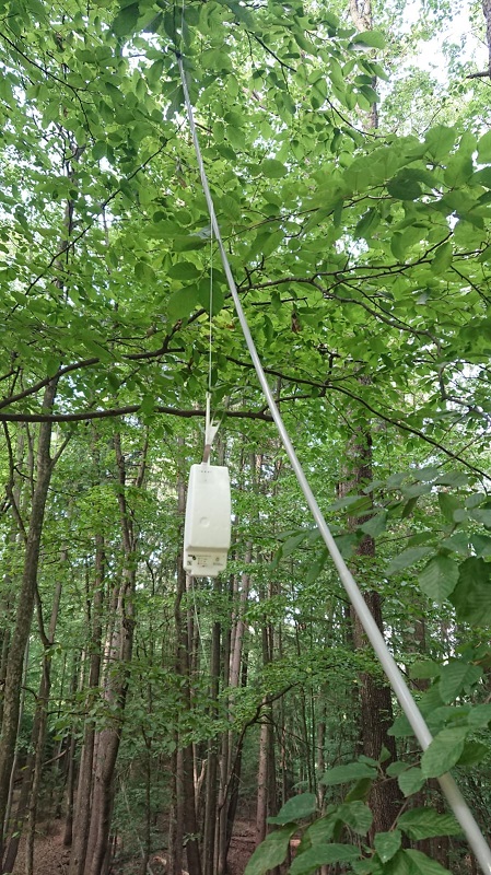 Sonde am Boden, Schnur in die Baumwipfel hinauf zum Schirm