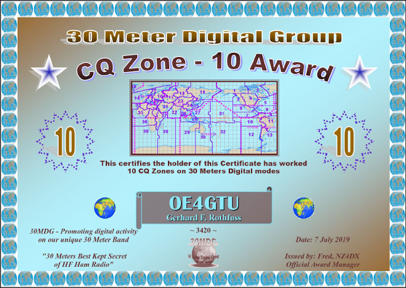 RULES Award Manager NZ4DX 30MDG CQ Zones 4 CQ Awards: Work 10, 20, 30 and 40 unique CQ Zones on 30 Meters Digital Modes.