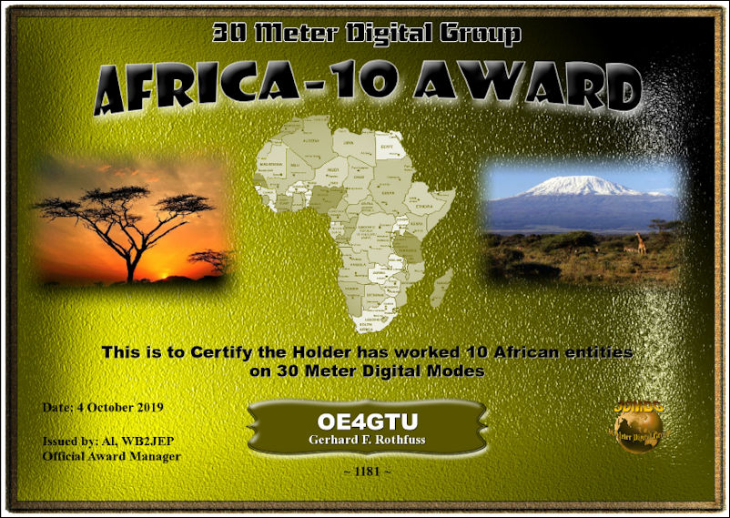 RULES Award Manager WB2JEP Africa Award Work 10 unique African Entities (countries) on 30 Meters Digital Modes.