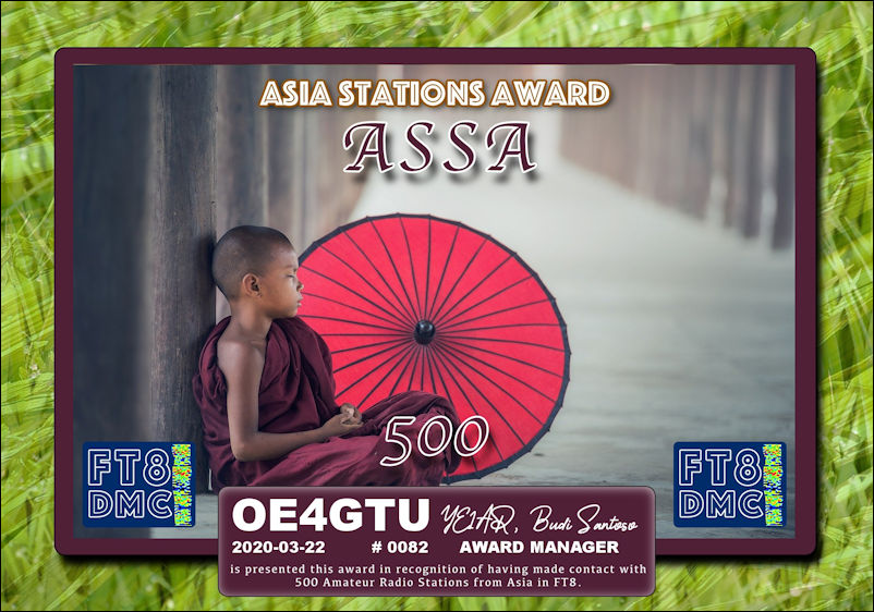 In recognition of international two-way FT8 amateur radio communication, the FT8 Digital Mode Club (FT8DMC) issues Asia-Stations-Award certificates to amateur radio stations and SWL of the world. Qualification for the FT8 ASSA award is based on an examination by the FT8 ASSA Award Manager.