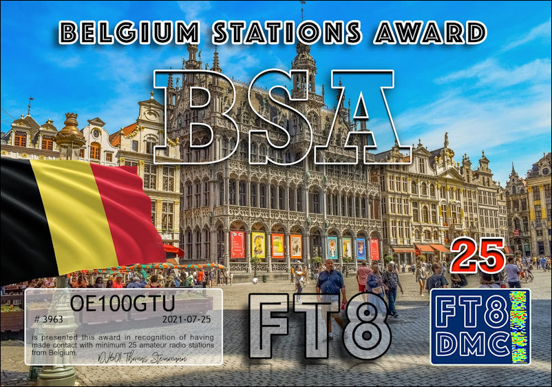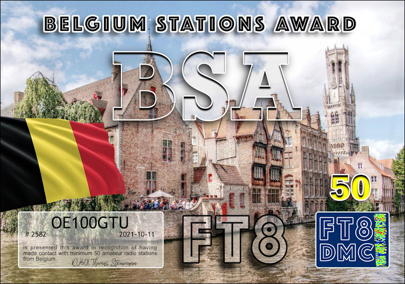 In recognition of international two-way FT8 amateur radio communication, the FT8 Digital Mode Club (FT8DMC) issues Belgium-Stations-Award certificates to amateur radio stations and SWL of the world. Qualification for the FT8 BSA award is based on an examination by the FT8 BSA Award Manager.