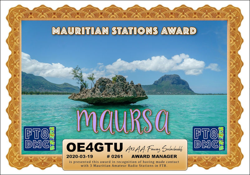 In recognition of international two-way FT8 amateur radio communication, the FT8 Digital Mode Club (FT8DMC) issues Mauretanian-Stations-Award certificates to amateur radio stations and SWL of the world. Qualification for the FT8 MAURSA award is based on an examination by the FT8 MAURSA Award Manager. The applicant has to prove that he has made contact with at least 2 different amateur radio stations from Mauritania.