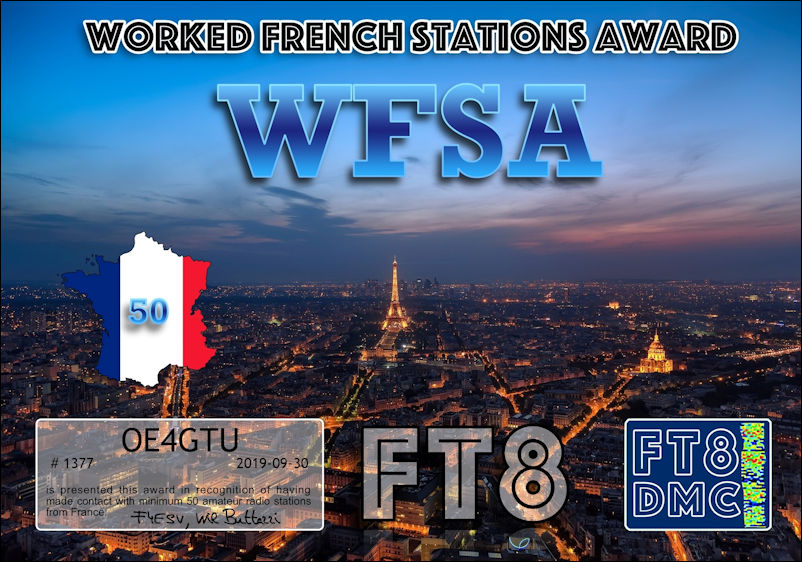 In recognition of international two-way FT8 amateur radio communication, the FT8 Digital Mode Club (FT8DMC) issues Worked-French-Stations-Award certificates to amateur radio stations and SWL of the world. Qualification for the FT8 WFSA award is based on an examination by the FT8 WFSA Award Manager.