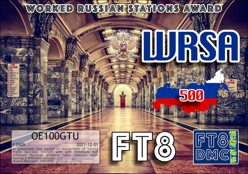 In recognition of international two-way FT8 amateur radio communication, the FT8 Digital Mode Club (FT8DMC) issues Worked-Russian-Stations-Award certificates to amateur radio stations of the world. Qualification for the FT8 WRSA award is based on an examination by the FT8 WRSA Award Manager, from QSOs that the applicant has made contact with Russian amateur radio station with minimum 100 different amateur radio stations each having a different callsign.