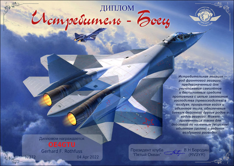 Im Jahr 2022 im Zeitraum vom 25.03.2022 bis 30.04.2022 müssen Bewerber 106 Punkte erreichen, im Jahr 2023 müssen Bewerber 107 Punkte erreichen, usw.Für den Funkkontakt mit Mitgliedern des Fifth Ocean Clubs, Angestellten oder zuvor gedient in Fighter Aviation als Piloten, Navigatoren, Flugfunker, Flugingenieure, Flugmechaniker usw. R1TZ, R2DNW, R3DAG, R3KCC, R6BH, R6UAC, R9WG, RK3IR, RU3VQ, UA3VSX UB3B und OK8KO, gibt es 10 Punkte.