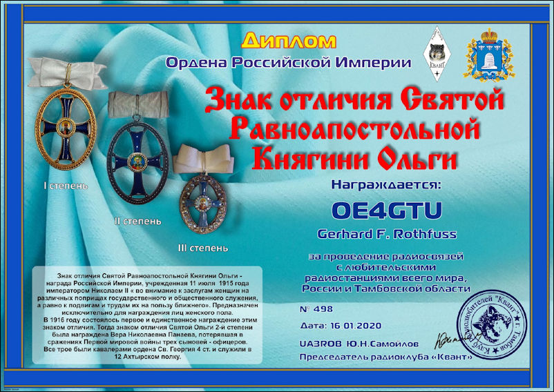 12. Der Orden des Hl. Andreas des Ersten. Es sind dafür 80 QSO's mit verschiedenen Regionen Russlands notwendig.Ein QSO mit der Region Tambow ist für jeden Orden obligatorisch.