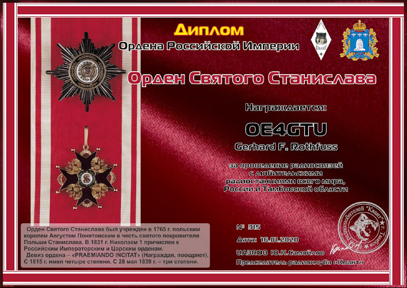 4. Der St.-Stanislav-Orden ist der polnische Orden. Es sind dafür 28 QSO's mit verschiedenen Regionen Russlands notwendig.