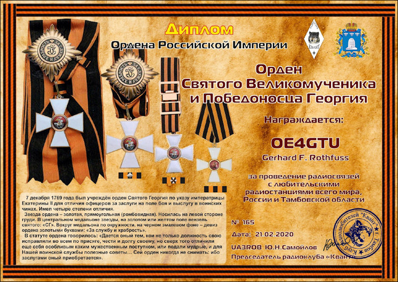 9. Der Orden des Heiligen Großen Märtyrers und des Siegreichen Georg. Es sind dafür 63 QSO's mit verschiedenen Regionen Russlands notwendig.
