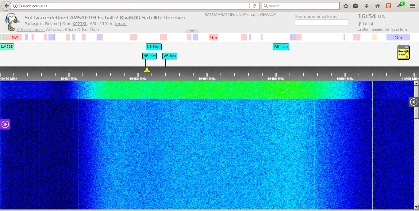 - in the waterfall, the LNB is first seeing Cold Sky (slighly overcast) and then CS + uncalibrated radiated noise from a waveguide noise source
