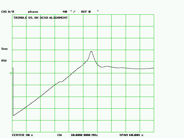 here is a plot of a typical OCXO after alignment: the short-term stability is excellent and the phase drift is -154.4 degrees in 50 seconds yielding a Δf/f of 8.6*10-10 (downwards)