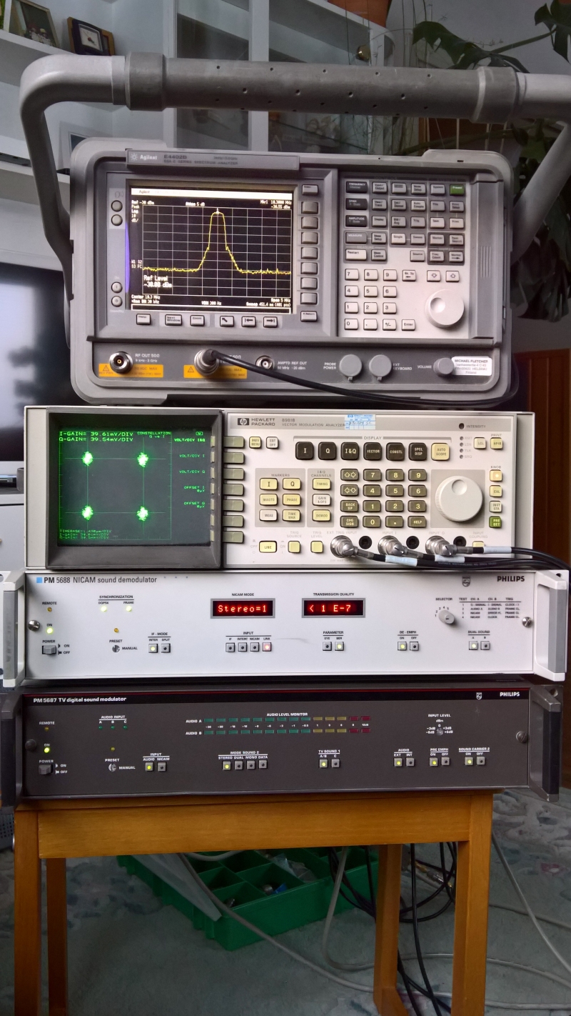- my 728 kbit/s, PAL B/G 5.85 MHz subcarrier NICAM test setup: modulator, demodulator, IQ/constellation/Eye-Height analyzer, and spectrum (17.01.2018)