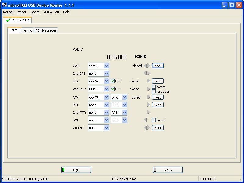 Asenna digi-systeemi ja kaikkiin samat oikeat asetukset --> porttit, CAT rate nopeus bps, mahdollinen DTR ja RTS) myös (rigi, pc laitehallinta, Router, digi-ohjelma, huom. kaikkiin samat asetukset). Nyt joudut lukemaan Digi-laitteen manuaalia.