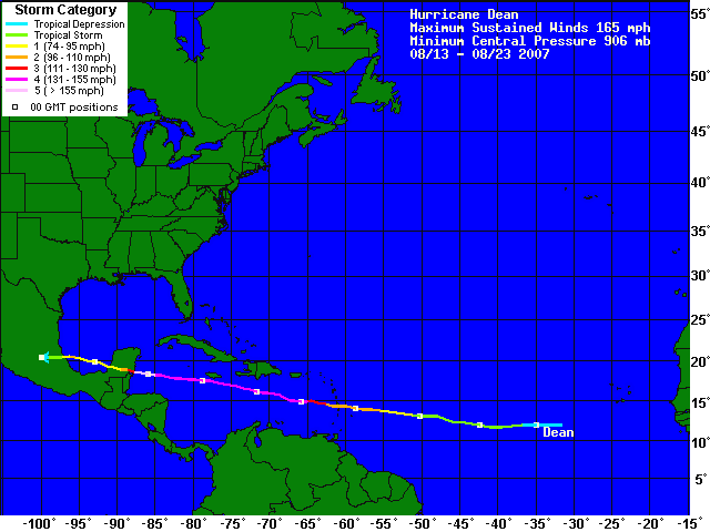 Dean se pohybuje rychlostí 30 kilometrů v hodině, přičemž jeho větry mají rychlost maximálně 130 kilometrů