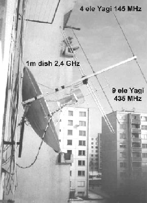 Uchytenie antén – mechanická konštrukciaMalý systém upevníme tak, aby sme mali možnosť experimentovať a aby napájacie káble boli čo najkratšie. Otáčanie môžeme riešiť jednoducho – ručne. Zdánlivý pohyb družice je pomalá, preto stačí, keď antény dosmerujeme po ?-1 hod. Pre experimenty je tiež vhodný jednoduchý statív, alebo držiak pri okne. Moje riešenie je nasledovné: môj satelitný antenný sytém je na streche s diaľkovým otáčaním AZ/EL, ale parabolu z viacerých príčin som nechcel namontovať hore (viac ako 30 m dlhý zvod, obmedzená možnosť experimentovania, atď.), preto som namontoval na okenný rám malý systém, ktorý môžem otáčať ručne v obidvoch rovinách. Malý systém sa skladá z antény 4 el Yagi pre 2m, a zo spomínaných antén 9 el Yagi na 70 cm a 1m paraboly na 13 cm. Táto malá sústava nájde uplatnenie pri práci cez družice FO-20 a FO-29, ale aj ako náhradný alebo druhý anténny systém.