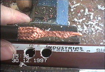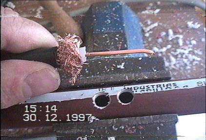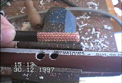 Twist the braid, joining it with the inner conductor. Then bend them, near the end of the sleeve, at 90 degrees, to help passing them through the holes.