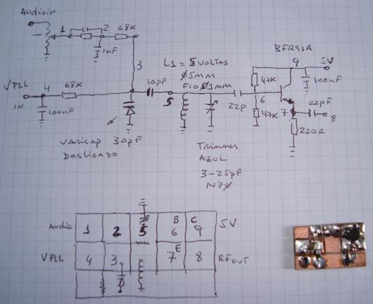 Aqui o BFR91 foi escolhido e o circuito é simples e facil de reproduzir. A bobina não tem segredos e o diodo varicap pode ser encontrado em seletores de canais de TV (normalmente SMD preto com lista branca).