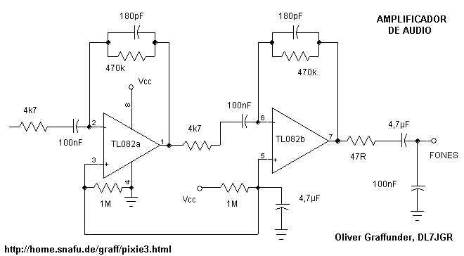Utilizamos como amplificador de áudio um circuito visto originalmente no projeto do Pixie 3 de DJ7JGR o colega Oliver, como o circuito apresenta um bom ganho e uma ótima qualidade de som, optamos por ele.