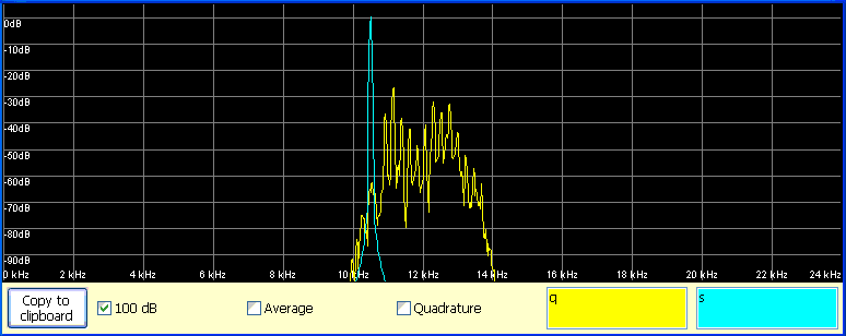 Os sinais I e Q na saída do SDR são idênticos espectralmente (figura seguinte), pois o espectro é uma representação amplitude versus freqüência. Eles diferem na fase, e é justamente isso que permite rejeitar a freqüência imagem.