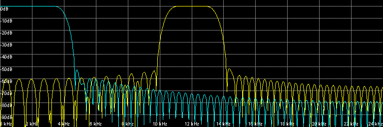 A resposta em freqüência dos filtros passa-faixa é a curva amarela seguinte. A curva azul é do filtro passa-baixo, usado mais adiante: