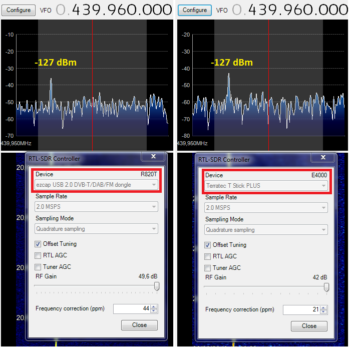 A figura seguinte mostra que os dois tem praticamente a mesma sensibilidade (menos de 1 dB melhor para o R820T), sendo que o R820T tem um patamar de ruído 10 dB maior (pior) que o E4000 em UHF. Um sinal de -127 dBm aparece 20 dB acima do ruído médio. Nas especificações, o E4000 tem um NF da ordem de 4 dB, e o R820T de 3,7 dB.